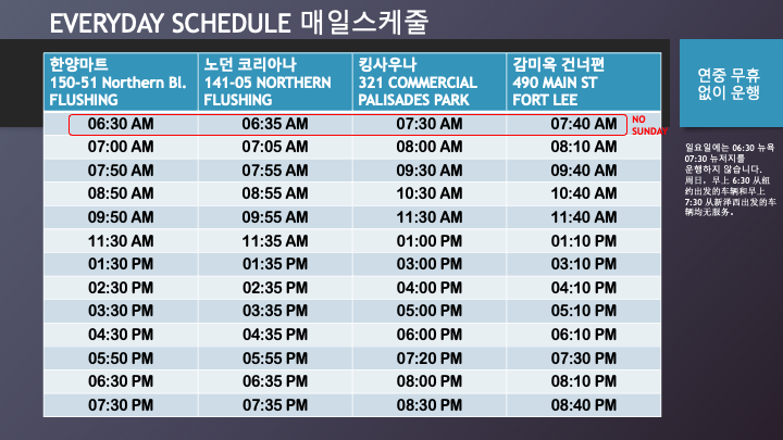 일요일에는 06:30 뉴욕 07:30 뉴저지를 운행하지 않습니다.